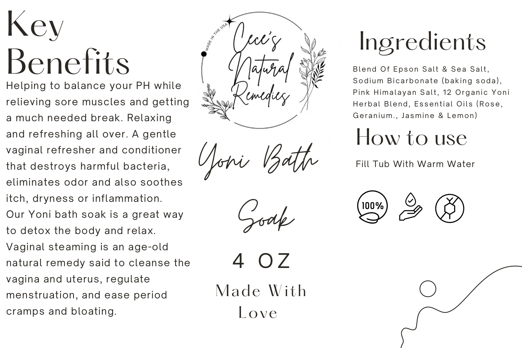 Ingredients: Blend Of Epson Salt & Sea Salt, Sodium Bicarbonate (Baking Soda) ,Pink Himalayan Salt, 12 Blend Yoni Herbs, Essential Oils (Rose, Geranium, Jasmine, & Lemon)